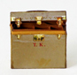 Morocco leather dark brawn cosmetic box the crystal bottles have silver lids stamped L.V. logo, onion like figure. This trunk is small, but filled with function and luxury. (original size/300w x 180d x 115h mm/11.8 x 7.1 x 3.9inch) 26w x 11d x 16h mm |