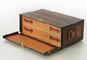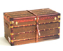 茶ヴィトニット引出し付トランク 英国ヨーク近辺で毛織物のサンプル運搬に使用されたもよう。引出しは2段で黄橙外張りと麻内張り。左右の持ち手、中央の留め金具に特徴。 |